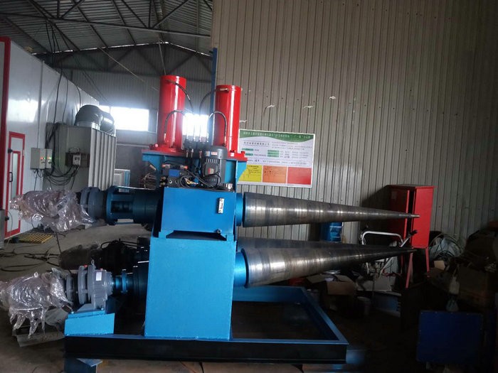錐形卷板機卷板進程與進程一般都選用強制送料的辦法,靠錐形小口與卷板機前端強制限位擋塊磨擦,迫使錐形大小口成型發(fā)生速度差,到達卷板機上輥的素線一直與錐形坯料的素線重合,完結(jié)錐形成型,所以錐形小口下料時有留有錐形小口與卷板機限位擋塊彼此磨損效果的工藝余量。